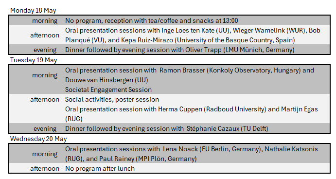 The origin and nature of life, as well as its presence beyond the Earth, are questions that fascinate the general public and inspire scientists from many disciplines. In the Netherlands, research on the emergence of life and evolution is coordinated by the Origins Center. At the conference, a multidisciplinary group of scientists, including geoscientists, evolutionary biologists, ecologists, chemists, physicists, mathematicians, and astronomers will update each other about recent developments in their fields. The goal is to inspire one another and to start exciting new interdisciplinary collaborations. The topics of this meeting are aligned with the main research themes of the Origins Center: